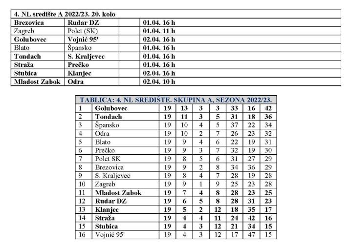 Pred nama su utakmice 20. kola 4. NL središte – skupina A. Pet utakmica na rasporedu je danas, a tri sutra. Kolo će danas, već u 11 sati otvoriti Zagreb i Polet (SK). U Zagorju se danas igraju dvije utakmice. Od 16 sati Tondach dočekuje Sesvetski Kraljevec, a Straža Prečko. U isto vrijeme Rudar DZ gostuje kod Brezovice. Danas još igraju i Blato i Špansko. Sutra se igraju tri utakmice i sve tri u Zagorju. Već u 10 sati Mladost Zabok dočekuje Odru, a poslijepodne je na rasporedu jedan zagorski, ali i derbi začelja, u kojem Stubica dočekuje Klanjec. Vodeći Golubovec će pak dočekati zadnji Vojnić '95'.