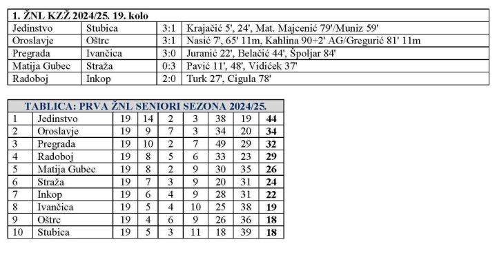 Odigrano je i 19. kolo 1. zagorske nogometne lige. Riječ je o prvom kolu trećeg kruga, pa je napravljen novi raspored i to na temelju poretka nakon 18. kola. Tako je vodeće Jedinstvo dočekalo zadnju Stubicu i slavilo sa 3:1. Ostalo je tako na plus deset, ima 44 boda. Oroslavje je sa istim rezultatom dobilo Oštrc i na drugom mjestu ima 34 boda. Pregrada je sa 3:0 pobijedila Ivančicu i drži treće mjesto sa 32 boda. Radoboj je sa 2:0 bio bolji od Inkopa i sada je na četvrtom mjestu sa 29 bodova. Straža je slavila sa 3:0 kod Matije Gupca, koji je na petom mjestu sa 26 bodova, a Straža se probila na šesto mjesto sa 24 boda i sve je sigurnija. Inkop na sedmom mjestu ima 22 boda, a trojku na začelju čeka velika borba za opstanak. Ivančica ima 19, a Oštrc i Stubica po 18 bodova. U 20. kolu vodeće Jedinstvo gostuje kod Oštrca, a vrlo zanimljivo bi moglo biti u utakmicama Ivančica – Oroslavje i Straža – Pregrada. Stubica opet ima teško gostovanje, kod Radoboja, a Inkop će dočekati Matija Gubec. Utakmice se igraju u nedjelju 27. travnja u 17 sati.