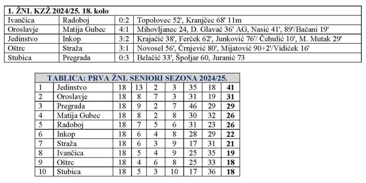 Odigrano je i 18. kolo 1. zagorske nogometne lige. Vodeće Jedinstvo gubilo je 0:2, ali je stiglo do preokreta i slavilo sa 3:2. pa i dalje ima velikih deset bodova prednosti pred Oroslavjem, koje je sa 4:1 pobijedilo NK Matija Gubec. Jedinstvo ima 41, a Oroslavje 31 bod. Sigurna je bila i treća Pregrada, koja je sa 3:0 slavila kod Stubice i ima sada 29 bodova. Matija Gubec na četvrtom mjestu ima 26 bodova, baš kao i peti Radoboj, koji je sa 2:0 slavio kod Ivančice. Od šestog mjesta kreće realna borba za opstanak, jer je pet ekipa u četiri boda. Inkop ima 22 boda, a Straža 21, nakon poraza kod Oštrca. Ivančica je osma sa 19 bodova, a Oštrc, koji je u jako važnoj utakmici stigao do 3:1 protiv Straže, popeo se na deveto mjesto sa 18 bodova, koliko ima i zadnja Stubica. Pred nama je treći krug natjecanja, zadnjih devet kola, u kojima je prema rezultatima napravljen novi ždrijeb. Tako će u 19. kolu vodeće Jedinstvo dočekati zadnju Stubicu, Oroslavje je domaćin Oštrcu, Pregrada dočekuje Ivančicu, Matija Gubec Stražu, a Radoboj Inkop. Utakmice se igraju na Uskrsni ponedjeljak u 16.30 sati.