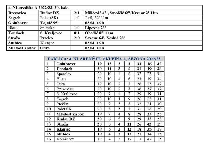 U 20. kolu 4. NL središte – skupina A, danas su na teren izašla tri zagorska kluba. I dok su Tondach i Rudar DZ poraženi, Straža je došla do iznimno vrijedne pobjede, 2:0 kod kuće protiv Prečkog, pa je privremeno preskočila Klanjec na ljestvici. Tondach pak nikako da uhvati formu, te je doživio već treći proljetni poraz. Ovaj puta u Bedekovčini je slavio Sesvetski Kraljevec sa 1:0 i prekinuo niz domaće nepobjedivosti Tondacha još od 27. studenoga 2021. kada je, zanimljivo istim rezultatom u Bedekovčini slavila Stubica. Rudar DZ je pak poražen kod Brezovice. Bilo je 2:1 za domaćine, koji imaju jedini svih pet proljetnih pobjeda i jure prema vrhu tablice. Da Tondach i dalje ostane na drugom mjestu pobrinulo se Blato, koje je sa 1:0 pobijedio Špansko, dok je Zagreb istim rezultatom svladao Polet. Sutra na treće mjesto može Odra, ali za to bi trebala pobijediti u Zaboku Mladost na matineji u 10 sati. U 16 sati je pak na rasporedu zagorski derbi Stubica – Klanjec, dok vodeći Golubovec dočekuje zadnji Vojnić '95 i ima priliku pobjeći na velikih 9 bodova Tondachu.