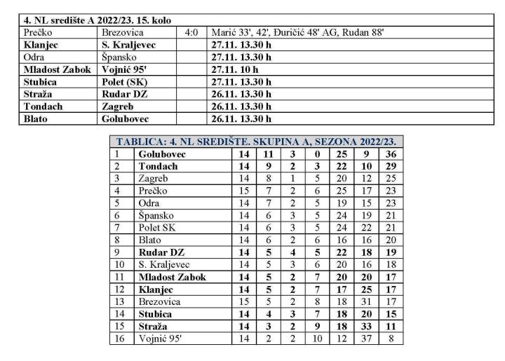 Pred nama je 15. kolo 4. NL središte, skupina A, posljednje ove jeseni. Donosi jedan zagorski derbi. Već danas u 13.30 sati Straža će dočekati Rudar DZ. Danas još igraju Tondach – Zagreb i Blato – Golubovec. Podsjetimo, Golubovec je već osigurao jesenski naslov, a Tondach drugo mjesto.