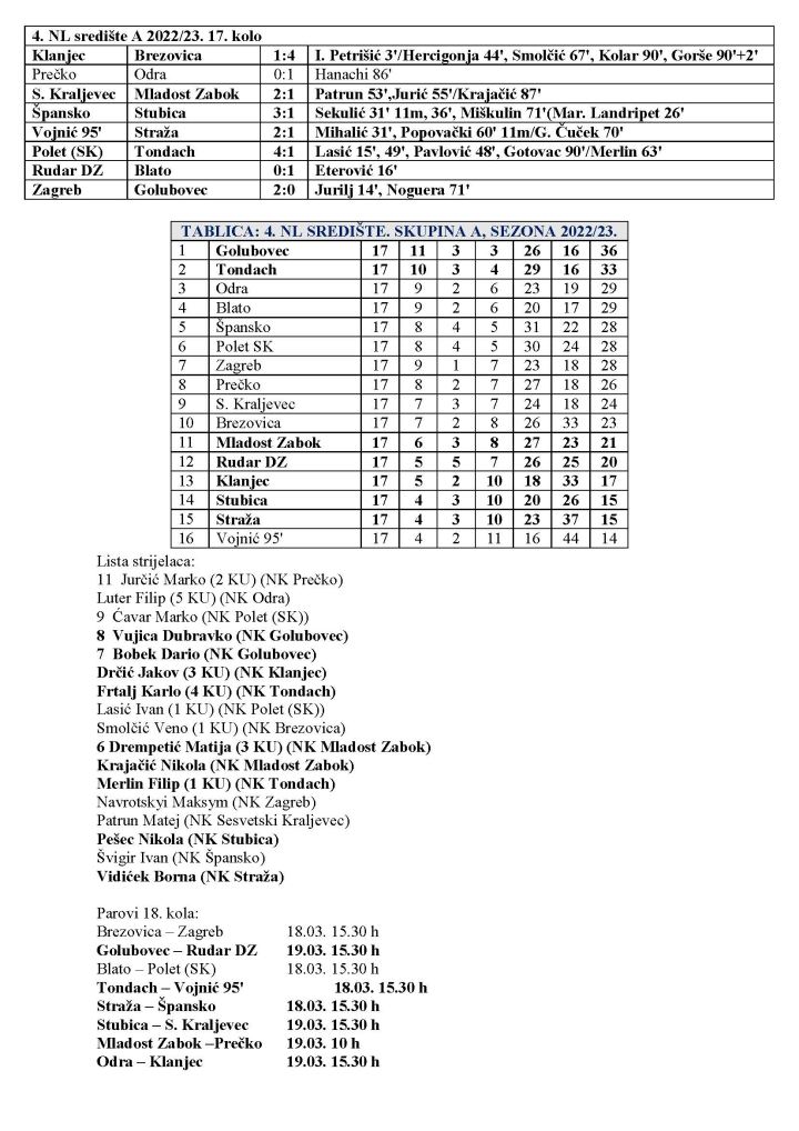 Ovome se nikako nismo nadali. Kolo bez zagorskih derbija u 4. NL središte skupina A ponudilo je i kolo bez ijednog 'zagorskog' boda. Baš prava katastrofa. U prva dva proljetna kola još nismo dočekali ni jednu zagorsku pobjedu. I dok je još u prvom proljetnom kolu bilo barem remija, jedan i u zagorskom derbiju, u 17. kolu baš svih sedam poraza. Krenulo je loše još u subotu u 11 u Zagrebu, gdje je vodeći Golubovec poražen 0:2. Nastavilo se poslijepodne. Polet (SK) je sa čak 4:1 pobijedio drugi Tondach, Sesvetski Kraljevec je sa 2:1 pobijedio Mladost Zabok, a Špansko je sa 3:1 bilo bolje od Stubice. U vrlo važnom derbiju začelja Vojnić '95 je sa 2:1 pobijedio Stražu, koja se žali na suđenje, točnije na društvenim mrežama nazvali su to krađom. U nedjelju smo se nadali da mogu dojam popraviti Rudar DZ i Klanjec u domaćim utakmicama, ali ništa od toga. Blato je sa 1:0 slavilo kod Rudara DZ, a Brezovica je sa 4:1 slavila u Klanjcu. Pogleda na vrh ljestvice još uvijek je ugodan, jer iza vodećeg dvojca velika je borba i izjednačenost. Golubovec bodi sa 36 bodova, Tondach ima 33. Još uvijek solidan prednost pred Odrom i Blatom koji su na 29. Čak tri ekipe imaju po 28 bodova, Špansko, Polet (SK) i Zagreb. Preostalih pet zagorskih klubova sada su se okupili od 11. do 15. mjesta. Mladost Zabok ima 21 bod, Rudar DZ 20, a jako je opasno za Klanjec na 17 i posebno Stubicu i Stražu na 15 bodova, jer Vojnić '95 sa dvije proljetne pobjede već je na 14. U 18. kolu na rasporedu je jedan zagorski derbi. Naime, u nedjelju će vodeći Golubovec dočekati Rudar DZ. U Zagorju možete odabrati jednu od još četiri utakmice. U subotu Tondach dočekuje Vojnić 95', a Straža Špansko. U nedjelju u 10 sati Mladost u Zaboku dočekuje Prečko, u 15.30 Stubica je domaćin Sesvetskom Kraljevcu, a Klanjec gostuje kod Odre.