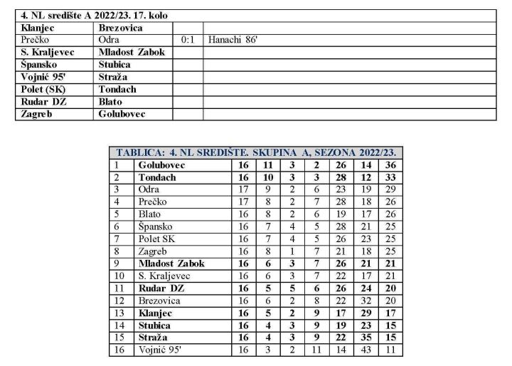 Nakon što u prvom proljetno kolu 4. NL središte skupina A, ni jedan od sedam zagorskih predstavnika nije ostvario pobjedu, pred nama je drugi proljetni nastup, točnije 17. kolo. U ovom kolu nemamo na rasporedu ni jedan zagorski derbi, a samo dva kluba igrat će na domaćem terenu i to oba sutra.