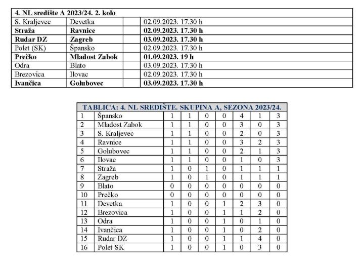 Već danas počinje 2. kolo 4. NL središte skupina A. Kolo će otvoriti utakmica Prečko – Mladost Zabok, večeras u 19 sati. Zabočani na ovom nimalo jednostavnom gostovanju traže potvrdu dobrog starta u sezonu od koje puno očekuju. Inače, ovo kolo donosi i jedna zagorski derbi. U nedjelju će u Zlatar Bistrici u 17.30 sati igrati Ivančica i Golubovec. Gosti kao branitelji naslova favoriti su protiv novaka u ligi. U isto vrijeme Rudar DZ će dočekati Zagreb i pokušati provu domaću utakmicu okruniti pobjedom. Dan prije, sutra Straža u 17.30 dočekuje Ravnice. Nakon boda kod Zagreba, Straža ima tešku utakmicu protiv ekipe koja je stigla iz višeg ranga. U ostalim utakmicama Sesvetski Kraljevec dočekuje Devetku, Polet (SK) Špansko, Odra – Blato, a Brezovica Ilovac.