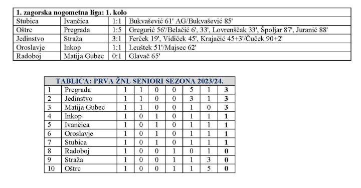 Odigrano je 1. kolo 1. zagorske nogometne lige. Na startu smo vidjeli smao jednu domaću pobjedu i to Jedinstva protiv Straže, koja se u ligu vratila iz 4. NL središte. Jedinstvo je na odmor otišlo sa 3:0, a Straža je u nastavku samo smanjila za konačnih 3:1. No, vrh ljestvice nakon prvog kola drži Pregrada, koja je sa visokih 5:1 slavila kod Oštrca. Do gostujuće pobjede stigao je i povratnik iz 2. zagorske lige, Matija Gubec, koji je sa 1:0 slavio kod Radoboja. Dvije su utakmice završile bez pobjednika i to po sličnom scenariju. Na poluvremenu nije bilo golova, pa su u nastavu poveli domaćini, ali su se gosti vratili. Riječ je o utakmicama Oroslavje – Inkop i Stubica – Ivančica, gdje treba dodati da su domaćini u prvom poluvremenu promašili i kazneni udarac. U 2. kolu Stubica će imati drugu zaredom domaću utakmicu, u kojoj dočekuje Oštrc, a tu je i uvijek zanimljiva utakmice između Ivančice i Matije Gupca. Inkop će biti domaćin Radoboju, a Straža Oroslavju. Vrlo zanimljivo moglo bi biti u Pregradi, gdje će Pregrada dočekati Jedinstvo. Sve utakmice na rasporedu su u nedjelju 1. rujna, s početkom u 17.30 sati.