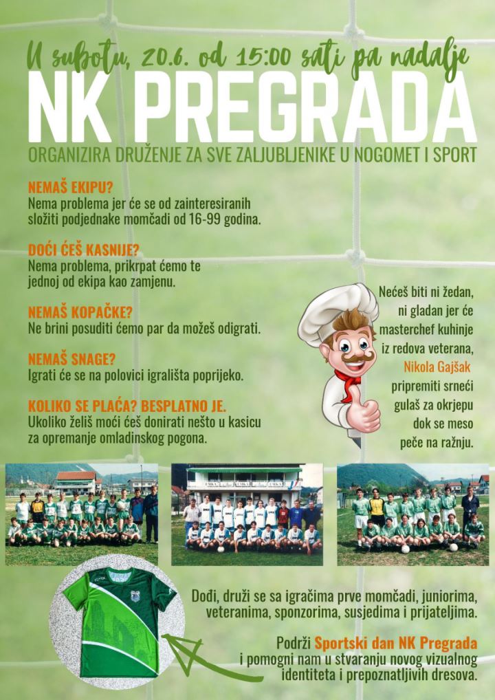 Nogometni klub Pregrada organizira druženje za sve zaljubljenike u nogomet i sport u subotu, 20. lipnja od 15 sati na sportskim terenima u Pregradi. Od zainteresiranih će se složiti podjednake momčadi od 16-99 godina, igrat će se na polovici igrališta, a hrana i piće su osigurani. Ukoliko želiš moći ćeš donirati nešto u kasicu za opremanje omladinskog pogona. Želja je da svi imaju dizajnirane dresove s obilježjima Grada Pregrade. Tom prigodom prikupljat će se i donacije za opremanje omladinskog pogona, kako bi svi imali nove dresove s obilježjima Grada Pregrade te tako bili prepoznatljivi u Krapinsko-zagorskoj županiji.