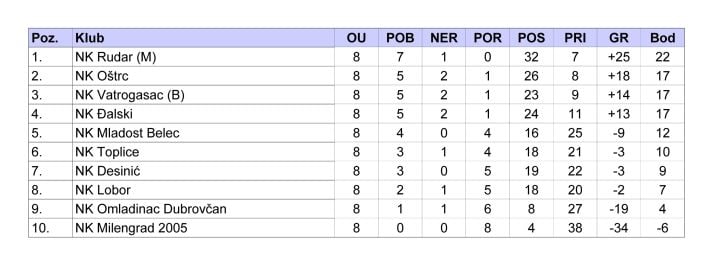 U 2. ŽNL ovim kolom završit će jesenski dio natjecanja. Jesenski je naslov osigurao Rudar M, koji će u nedjelju u 14.45 gostovati kod Đalskog. Ostale su utakmice na rasporedu u nedjelju u 14.30 sati. Oštrc će dočekati Desinić. Mladost B je domaćin Toplicama, Milengrad 2005. dočekuje Omladinac, dok je Lobor domaćin Vatrogascu. Iza Rudara tri kluba (Oštrc, Vatrogasac i Đalski imaju jednak broj bodova (17), pet manje od Rudara.