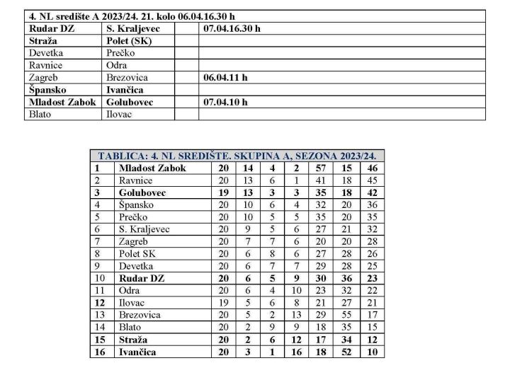 Danas kreće 21. kolo u 4. NL središte skupina A. No, vrhunac kola bit će sutra, jer ovo kolo donosi veliki zagorski derbi, u kojem Mladost u Zaboku dočekuje Golubovec. Ta je utakmica na rasporedu sutra u 10 sati. Naravno, riječ je i o derbiju lige, jer ove se dvije ekipe, uz Ravnice bore za naslov. Nešto kasnije sutra, u 16.30 sati Rudar će u Dubravi Zabočkoj, u drugoj uzastopnoj domaćoj utakmici dočekati Sesvetski Kraljevec. Već danas igrat će preostala dva zagorska predstavnika, također u 16.30 sati. Straža će dočekati Polet (SK), a Ivančica će u goste Španskom. U ostalim utakmicama, danas u 16.30 sati Devetka će dočekati Prečko, Ravnice Odru, Blato Ilovac, a već od 11 sati Zagreb Brezovicu.