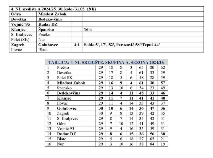 Već je krenulo 30. zadnje kolo u 4. NL središte skupina A. Iako se po običaju zadnja dva kola igraju u isto vrijeme, jedna utakmica, koja nije imala poseban utjecaj odigrana je jučer. Golubovec je u zadnjem nastupu doživio poraz kod Zagreba. Domaćini su slavili sa 4:1 i tako sezonu završavaju na desetom mjestu sa 25 bodova, a Golubovec na devetom sa 36 bodova. I prije zadnjeg kola prvak je poznat to je Prečko, koje će sezonu završiti na gostovanju kod Sesvetskog Kraljevca, koje se još bori da izbjegne 14. mjesto, koje može (iako i ne mora) biti ono koje vodi natrag u županijsku ligu. Dovoljan mu je bod, ili da utakmica Vojnić '95 Rudar DZ ne završi bez pobjednika. Rudar dakle ima sve u svojim rukama, pobjedom sigurno izbjegava 14. mjesto, porazom je sigurno 14. a u slučaju boda, ovisi o drugim rezultatima. Bod više ima i Odra, koja dočekuje Mladost iz Zaboka. No, niti to 14. mjesto ne mora biti 'opasno'. Sigurno ste već čitali da će se Dinamo II i Hajduk II vjerojatno ipak priključiti u 1. HNL, dakle drugi rang natjecanja, i da će se ta liga širiti na 16 klubova, sa sadašnjih 12. Nije još detaljno objašnjeno kako će se popunjavati, ali logika govori da bi prva tri kluba iz 2. HNL trebali upasti u prvu. U takvom raspletu, još je nejasno kako će se popunjavati 2. HNL, tj. koliko će klubova ispasti iz nje. Moguće da nijedan neće u 3. NL centar, a ako se prvak Lučko plasira u 2. HNL; onda će iz 3. NL centar ispadati samo jedan klub. Ako se HAŠK 1903 u zadnjem kolu spasi, onda nitko neće ispasti u 4. NL središte skupina A, pa će iz nje ispadati dva kluba (Blato i Nur). U tom slučaju i 14. na ljestvici ostao bi u ligi. Naravno, kako to često biva u našem nogometu, sezona je skoro gotova, a puno je još upitnika u zraku. Inače, u subotu će još igrati Klanjec i Špansko, jedini u 16 sati, Devetka – Bedekovčina, Polet (SK) – Nur i Ilovac – Blato. Svi oni igraju u 18 sati.
