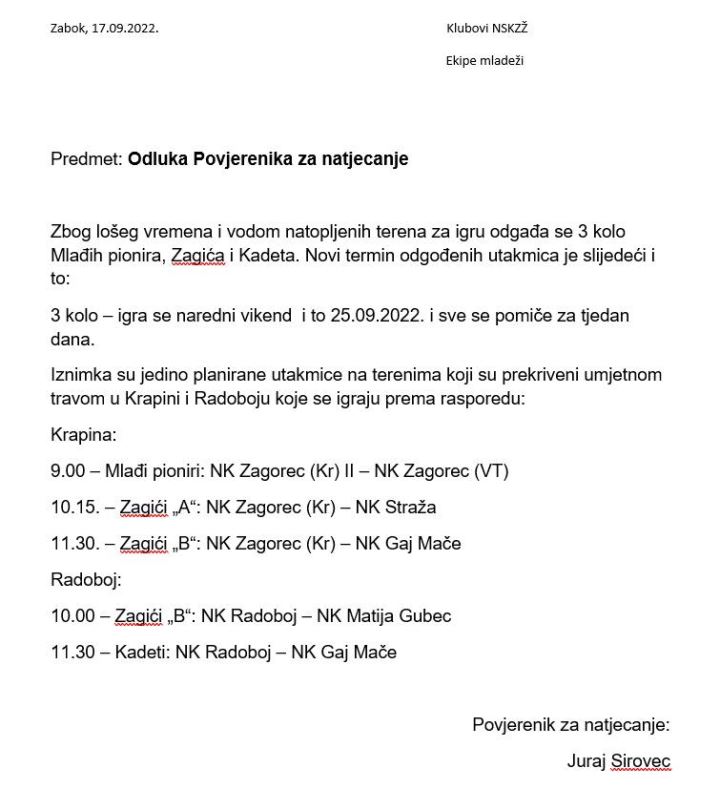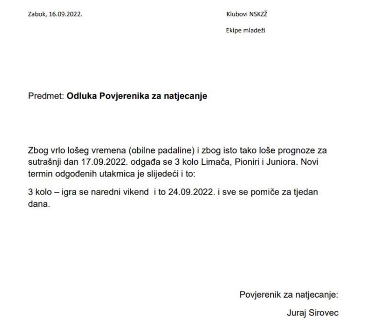 Zbog lošeg vremena odgođene su skoro sve utakmice mladeži ovoga vikenda u ligama KZŽ. Izuzetak su utakmice koje se sutra igraju na umjetnoj travi.