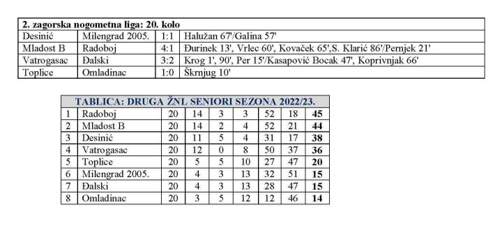 Odigrano je i 20. kolo 2. zagorske nogometne lige. Derbi je odigran u Belcu, gdje je druga Mladost dočekala vodeći Radoboj, koji bi bodom osigurao naslov. No, slavila je Mladost i to sa 4:1 i tako je odluka o naslovu prebačena za zadnje kolo. Naime, sada Radoboj ima 45, a Mladost B 44 boda. Desinić je odigrao 1:1 protiv Milengrada 2005. i drži treće mjesto sa 38 bodova, dok je na četvrto mjestu Vatrogasaca sa 36 bodova, nakon 3:2 pobjede protiv Đalskog. Toplice su sa 1:0 svladale Omladinac i osigurale su peto mjesto, kolo prije kraja sa 20 bodova. Milengrad 2005. se popeo na šesto mjesto sa 15 bodova, koliko ima i sedmi Đalski, dok je zadnji Omladinac sa 14 bodova. Rasplet slijedi u zadnjem kolu, Radoboj dočekuje Desinić, a Mladost B gostuje kod Đalskog. U preostale dvije utakmice Omladinac će dočekati Vatrogasca, dok će Milengrad 2005. biti domaćin Toplicama. Utakmice su na rasporedu u nedjelju 4. lipnja u 18 sati.