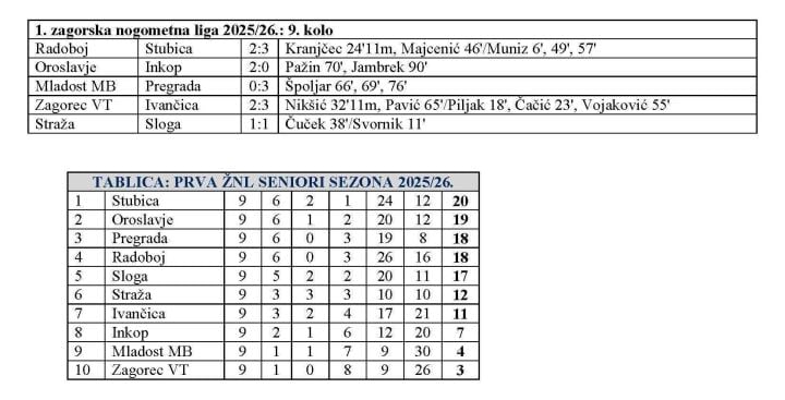 Odigrano je deveto kolo 1. zagorske nogometne lige, zadnje u prvom od tri kruga. U velikom derbiju Stubica je u Radoboju slavila sa 3:2 i time opet preuzela vodstvo sa 20 bodova. Oroslavje se probilo na drugo mjesto sa 19 bodova, nakon pobjede 2:0 protiv Inkopa, dok je treća Pregrada sa 18 bodova, nakon pobjede kod Mladosti MB. Radoboj ej pao na četvrto mjesto sa 18 bodova također, a Sloga je peta sa 17 bodova, nakon 1:1 kod Straže, koja drži šesto mjesto sa 12 bodova. Do važne pobjede stigla je Ivančica, 3:2 kod Zagorca VT i sada na sedmom mjestu ima 11 bodova. Inkop je na osmom mjestu sa sedam, Mladost na devetom ima četiri, a zadnji Zagorec VT tri boda. Već na Dušni dan kreće drugi kruga prvenstva, od tri. Podsjećamo da zagorski prvoligaši i ove sezone igraju trokružno, a u ovom jesenskom dijelu odigrat će se još četiri kola. Već 10. kolo donosi dva derbija, tj. susrete ekipa iz vrha ljestvice. Oroslavje će dočekati Radoboj, a Stubica Slogu. Treća top pet ekipa Pregrada gostuje kod Zagorca VT, koji se pak bori za opstanak. U toj je borbi vrlo zanimljiva utakmica u Mariji Bistrici, gdje Mladost dočekuje Inkop, dok će u Humu na Sutli Straža biti domaćin Ivančici. I to su susjedi na ljestvici, ali u nešto lakšoj situaciji. Utakmice se igraju u nedjelju u 14.30 sati.