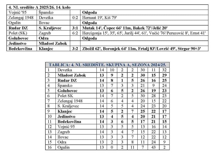 Odigrano je nekoliko utakmica 14. kola u 4. NL središte skupina A. Vrijeme je krojilo raspored pa su neke utakmice odgođene. U subotu je odigran zagorski derbi u Bedekovčini, u kojem su domaćini sa 3:2 pobijedili Klanjec i to nakon brzog preokreta u nastavku. Još se jedan zagorski derbi trebao igrati u subotu. Jedinstvo je trebalo dočekati Mladost Zabok, no utakmica je prebačena za ponedjeljak, i to u Zabok, dakle došlo je do zamjene domaćinstva, s obzirom na umjetnu travu u Zaboku. Devetka je sa 2:0 slavila kod Zelengaja 1948. i ostala na prvom mjestu sa 32 boda, a Mladost Zabok ima 29, bez utakmice protiv Jedinstva. Rudar DZ je odigrao svoju utakmicu i dobio Sesvetski Kraljevec sa 3:1, pa je skočio na treće mjesto sa 25 bodova, bod više od Španskog i dva više od Golubovca, čije su utakmice odgođene. Klanjec je sada na devetom mjestu sa 17 bodova, koliko ima i deseto Jedinstvo sa utakmicom manje, a Bedekovčina je stigla na 11. mjesto sa 15 bodova. Pred nama je 15. kolo, posljednje ove jeseni. Donosi jedan z– Polet (SK), Devetka – Ilovac i Špansko – Zelengaj 1948. No, sve to treba uzeti sa rezervom, s obzirom na vremenske, uvjete pa je teško vjerovati da će se sve utakmice odigrati, a nejasna je i 'sudbina' odgođenih utakmica.