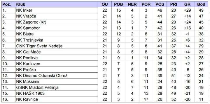 U 22. kolu Zagorec i Gaj Mače ostvarili su uvjerljive pobjede. Gaj je bio bolji od Prečkog, a Zagorec od Ponikvi. Lider Vrapče sretno je iščupao bod protiv Dinama OO na svom travnjaku. U derbiju kolu Inker je bio bolji od Samobora. Kurilovec je slavio protiv Ravnica koje su gotovo u bezizlaznoj situaciji. Mladost P osvojila je vrijedan bod kod Maksimira, pa je sada pretposljednji HAŠK koji je uvjerljivo poražen od Trešnjevke. Tigar se vratio pobjedama i na svom je travnjaku bio bolji od Bistre.