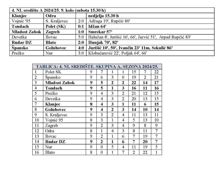Odigrano je skoro cijelo 9. kolo 4. NL središte skupina A. U velikom derbiju vodeći Polet (SK) slavio je sa 1:0 kod Tondacha i ostao na čelu sa 22 boda. Špansko je pak sa 4:0 svladalo Golubovec i ostalo drugo sa 21 bodom.