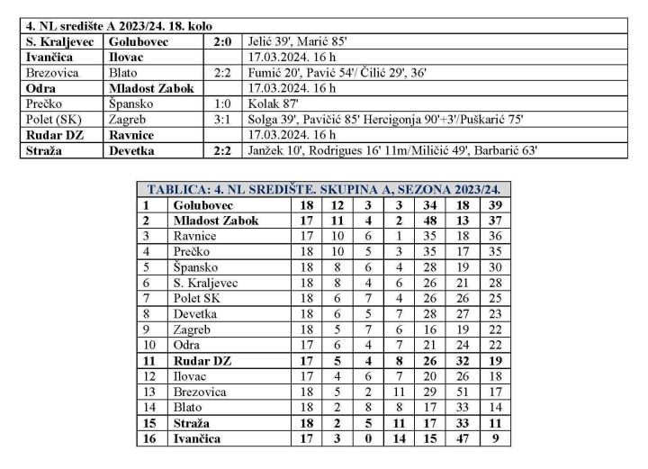 Nastavljen je proljetni dio 4. NL središte skupina A. I u 18. kolu na rasporedu nemamo zagorskih derbija. Danas su igrala dva zagorska kluba. Vodeći Golubovec poražen je kod Sesvetskog Kraljevca 0:2, no ostaje na čelu, barem do sutra, kada može pasti na drugo ili čak treće mjesto. Danas je Straža dočekala Devetku, imala 2:0 na poluvremenu, pred kraj i igrača više, ali je ne kraju završilo 2:2. Danas su još igrali Brezovica – Blato 2:2, a Polet SK – Zagreb 3:1. Još jučer Prečko – Špansko 1:0. Mladost Zabok igra kod Odre sutra u 16 sati i pobjedom može na prvo mjesto. Rudar DZ i Ivančica igraju također sutra, Rudar DZ dočekuje Ravnice, a Ivančica Ilovac. Ravnice su samo tri boda iza Golubovca, pa osim za sebe Rudar DZ na neki način igra i za zagorske klubove, koji se na vrhu bore s Ravnicama za naslov.
