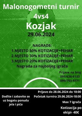 Iduća subota u Kozjaku, 29. lipnja, rezervirana je za malonogometni turnir 4vs4 s početkom u 18 sati.