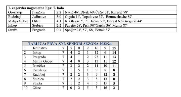 Odigrano je i 7. kolo 1. zagorske nogometne lige, uz dosta efikasne strijelce, pa je u pet utakmica palo dvadeset golova, ili četiri po utakmici. Nije bilo velikih promjena na ljestvici, ali se ona na vrhu zgusnula. Razlog tome je poraz vodećeg Jedinstva kod Radoboja, koji je slavio sa 3:0, ali i bod Inkopa kod kuće protiv Stubice, koja je dva pita vodila, ali se Inkop vraćao do 2:2. Tako je Jedinstvo ostalo na čelu sa 15 bodova, a Inkop drugi, sada sa 14 bodova. No, primakla im se Pregrada, na 13 bodova, nakon sigurne 4:0 pobjede kod Straže, a i Matija Gubec na 12 bodova, nakon što je sa 4:1 svladao Oštrc. Oroslavje i Ivančica su odigrali 2:2, nakon čega je Ivančica na petom mjestu sa 11 bodova. Dakle prvih pet klubova je u četiri boda, jedan bod jedni za drugima, od prvog do petog mjesta. Oroslavje je u sedam kola sakupilo čak pet remija i drži šesto mjesto sa osam bodova, koliko imaju i na sedmom mjestu Radoboj i na osmom Stubica. Straža, je predzadnja sa pet bodova, a Oštrc i dalje na samom dnu sa samo jednim bodom. U 8. kolu vodeće Jedinstvo dočekat će NK Matija Gubec, a zanimljivo bi moglo biti i u Zlatar Bistrici, gdje Ivančica dočekuje Pregradu. Oštrc će dočekati Inkop, a Oroslavje u drugoj uzastopnoj domaćoj utakmici dočekuje Radoboj. Stubica će pak biti domaćin Straži. Utakmice se igraju u nedjelju 13. listopada u 16 sati.