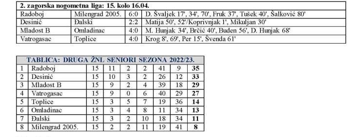Iza nas je 15. kolo 2. zagorske nogometne lige. Riječ je zapravo o početku trećeg kruga, ove sezone trokružnog natjecanja, u kojem su prve četiri ekipe s ljestvice dočekale preostale četiri. I nije prošlo bez iznenađenja, koje se dogodilo u Desiniću, gdje je istoimeni domaćin odigrao 2:2 protiv Đalskog. Radoboj pak nije imao problema te je sa 6:0 svladao Milengrad 2005. pa se odvojio na dva boda od Desinića (35-33). Mladost Belec je sa 4:0 pobijedila Omladinac i na trećem mjestu ima 29 bodova, dok je Vatrogasac istim rezultatom pobijedio Toplice i na četvrtom mjestu ima 27 bodova. Drugi dio ljestvice predvode Toplice sa 14 bodova, Omladinac ima 13, Đalski 11, a zadnji Milengrad 2005. 8 bodova. U 16. kolu vodeća dvojka je u gostima. Desinić će gostovati kod Omladinca, a Radoboj kod Đalskog. Vatrogasac će u Brezovi dočekati Milengrad 2005., a Toplice su domaćin Mladosti iz Belca. Utakmice se igraju u nedjelju 23. travnja u 17 sati, izuzev Omladinac i Desinića, koji igraju u subotu u 17 sati.