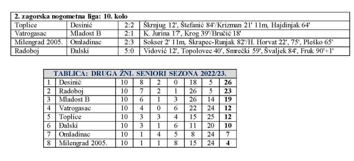 Iza nas je 10. kolo 2. zagorske nogometne lige. Vodeći Desinić i dalje ne zna za poraz, ali u ovom kolu drugi puta nije pobijedio. Lider je kod Toplica odigra 2:2 i propustio teoretski osigurati jesenski naslov kolo prije kraja. Desinić vodi sa 26 bodova, a Radoboj sada ima 23, nakon uvjerljivih 5:0 protiv Đalskog. Vatrogasac je sa 2:1 pobijedio Mladost Belec, pa se digao na četvrto mjesto sa 12 bodova. Mladost je ostala treća, ali sada sa četiri boda zaostatka za Radobojem (19). Pete su Toplice sa 12, šesti Đalski sa 10 bodova, a Omladinac je konačno stigao do prve pobjede. U gostima su slavili kod Milengrada 2005. i sada su sedmi sa sedam bodova, dok je Milengrad 2005. posljednji sa četiri boda. Druga zagorska liga ove se sezone igra trokružno, a u jesenskom dijelu ostaje za odigrati još 11. kolo. Vodeći Desinić ima težak izazov, jer gostuje kod Mladosti u Belcu. Radoboj je domaćin Toplicama i u te dvije utakmice kreirat će se poredak na vrhu. U preostale dvije utakmice sastaju se Omladinac – Vatrogasac i Đalski – Milengrad 2005. Utakmice se igraju u nedjelju 6. studenoga s početkom u 14 sati.