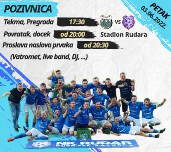 Sutra je na rasporedu prva utakmica posljednjeg, 22. kola 1. zagorske nogometne lige. Bit će to utakmica u Pregradi, u kojoj istoimeni domaćin dočekuje Rudar iz Dubrave Zabočke, koji je odavno stavio ruke na pehar, a nakon 20. kola i teoretski osigurao naslov pobjednika. No, sutra je osim utakmice na rasporedu i velika proslava Rudara DZ. Utakmica u Pregradi počinje u 17.30 sati i u njoj će Rudar DZ pokušati do dodatnog podviga, a to je da sve utakmice proljetnog dijela prvenstva završi sa pobjedama. Nakon utakmice primit će pehar, no tu priča sutrašnjeg dana ne završava. Nakon utakmice slijedi povratak u Dubravu Zabočku. U 20 sati predviđen je doček, a na igralištu u 20.30 počinje velika fešta uz vatromet, band uživo, DJ-a i iznenađenja. Iz kluba pozivaju sve navijače i simpatizere kao i prijatelje kluba da svi zajedno proslave naslov prvaka.