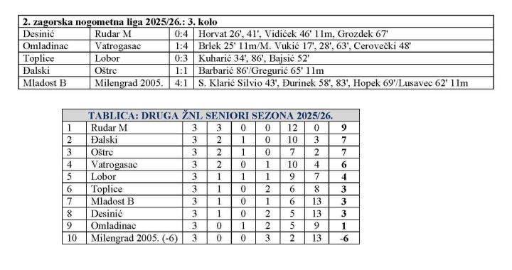 Odigrano je i treće kolo 2. zagorske nogometne lige. Samo je Rudar Mihovljan ostao maksimalan i drži vrh sa devet bodova. U ovo kolu Rudar je slavio kod Desinića sa 4:0 i uz devet bodova ima 12:0 gol razliku. Đalski i Oštrc igrali su 1:1, pa su ostali drugi i treći sa po sedam bodova. Vatrogasac je u gostima svladao Omladinac sa 4:1 i drži četvrto mjesto sa šest bodova. Lobor je slavio 3:0 kod Toplice, stigao je do prve pobjede i probio se na peto mjesto sa četiri boda. Toplice, Mladost B i Desinić imaju po tri boda. Mladost je ta tri boda osvojila u ovom kolu, nakon 4:1 pobjede protiv Milengrad 2005. Deveti je Omladinac sa jednom bodom, a Milengrad 2005. ima minus šest bodova. U 4. kolu dvije se utakmice igraju u subotu. Oštrc će u Zlataru dočekati Mladost iz Belca u gradskom derbiju, u koji domaćini ulaze kao favoriti. Favorit je i Rudar M koji dočekuje Milengrad 2005. Ta je utakmica na rasporedu u nedjelju. Drugi puta zaredom doma će igrati Desinić, koji u subotu dočekuje Omladinac, a u nedjelju Vatrogasa