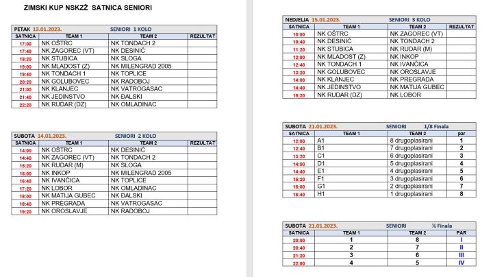 Završnica kreće od idućeg vikenda. Petak 20.1. 2023. godine rezerviran je za osminu finala veterana koja će započeti od 18 sati, a trajat će do 23,30 sati. Seniori će u osminu finala krenuti u subotu 21.1. 2023. u 12 sati, a od 20 do 22,40 istog dana očekuju nas četvrtfinalni ogledi u istoj konkurenciji. Između seniorske osmine finala i četvrtfinala u subotu od 17,20 do 20 sati četvrtinu finala odigrat će veterani. Veliki finalni dan je u nedjelju 23.1. i počet će u 15 sati. Veteransko finale je na rasporedu u 19, a seniorsko u 19,40 sati, nakon čega nas očekuje svečana dodjela nagrada.