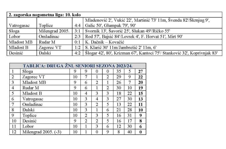 Odigrano je i 10. kolo 2. zagorske nogometne lige. Vodeća Sloga sa 3:1 je pobijedila Milengrad 2005. i sada ima 27 bodova. Zagorec VT je izbio na drugo mjesto sa 22 boda, nakon pobjede 2:1 kod Mladosti u Belcu. No, Sloga ima i utakmicu manje, pa je tako već sada osigurala jesenski naslov.