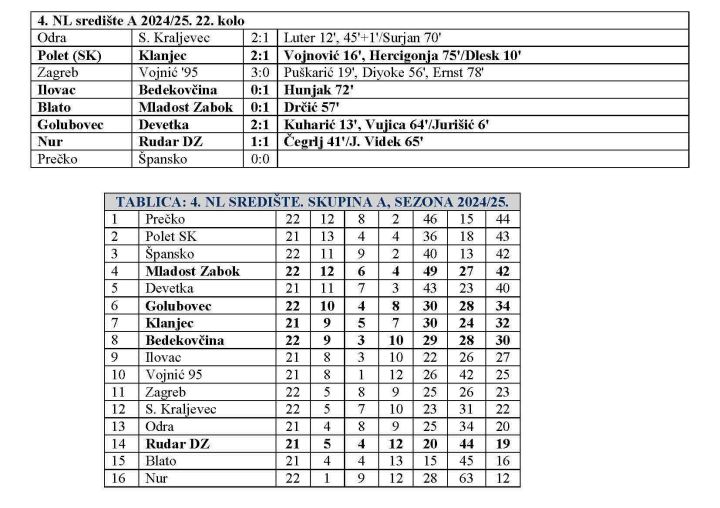 Odigrano je 22. kolo 4. NL središte skupina A. Bilo je to kolo koje je definitivno u igru za sam vrh, za prvo mjesto vratilo Mladost iz Zaboka, koja je stigla do minimalne, ali jako vrijedne pobjede kod Blata 1:0. U derbiju još u petak Prečko i Špansko odigrali su bez golova, a Zabočanima je pomogao i Golubovec, koji je pobijedio 2:1 Devetku. Nije pak pomogao Klanjec, koji je poražen kod Poleta u Svetoj Klari. Bilo je 2:1. No, nakon ovakvog raspleta pet je ekipa u četiri boda. Prečko ima 44, Polet (SK) 43, Špansko i Mladost Zabok po 42, a Devetka 40, s tim da Devetka i Polet imaju po utakmicu manje. Rudar DZ je pak kod zadnjeg Nura odigrao 1:1. Nur je zadnji, no izgleda da Rudar lakše igra sa ekipama iz vrha, jer nedavno je u gostima pobijedio Špansko, pa nakon toga remizirao sa Prečkom. Bedekovčina je u izravnoj borbi za osmo mjesto u gostima pobijedila Ilovac 1:0. Na ljestvici su tri zagorska kluba od šestog do osmog mjesta, Golubovec ima 34, Klanjec 32, a Bedekovčina 30 bodova, Klanjec sa utakmicom manje, protiv Ilovca, koja se igra 30. travnja. Rudar DZ je na 14. mjestu sa 19 bodova. Pred nama je 23. kolo. Kako je riječ o Uskrsnom vikendu, igra se od četvrtka do ponedjeljka. U četvrtak će Prečko u 19 sati dočekati odru, a prvi zagorski predstavnik koji će na teren je Mladost Zabok, koja u petak u 19 sati dočekuje Ilovac i traži novu pobjedu za održavanje priključka na vrhu. U subotu u 13.30 igraju Vojnić '95 i Polet (SK), a preostalih pet utakmica igra se na Uskrsni ponedjeljak u 17 sati. Čak tri će biti u Zagorju. U Dubravi Zabočkoj, u zagorskom derbiju igraju Rudar DZ i Golubovec, Bedekovčina dočekuje Zagreb, a Klanjec je domaćin Sesvetskom Kraljevcu. Još se sastaju Špansko – Nur i Devetka Blato. No, već prije toga, u srijedu 16. travnja u 17.15, Rudar DZ u zaostaloj utakmici 18. kola dočekuje Devetku.