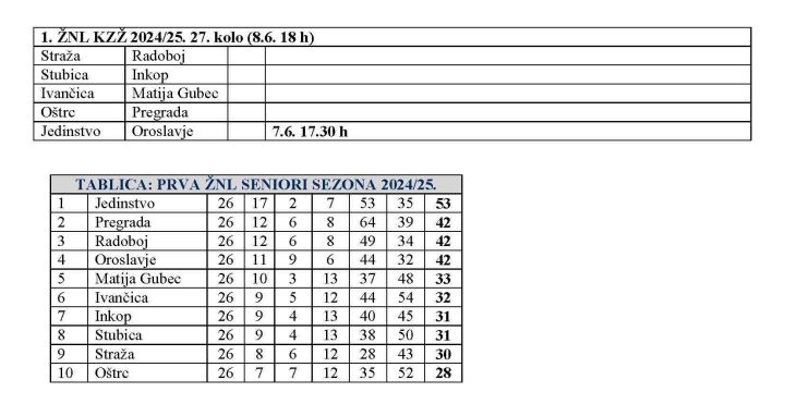 Ostale se utakmice igraju u nedjelju u 18 sati. U Zlatar Bistrici Ivančica dočekuje Matija Gubec i to je utakmica za peto mjesto, bez straha za ispadanje i za jedne i za druge. Trojka koja se bori za opstanak je Oštrc, Straža i Inkop. Najteže je Oštrcu jer ne odlučuje sam o svojoj sudbini. Ulazi u zadnje kolo sa zadnjeg mjesta sa 28 bodova. Dočekuje Pregradu i za bilo kakvu šansu igra mu jedino pobjeda. U tom bi slučaju došao na 31 bod. Straža ulazi u zadnje kolo sa 30 bodova i dočekuje Radoboj. Ako pobijedi sigurna je, s bodom čeka rezultat iz Zlatara. Stubica dočekuje Inkop. Iako i jedni i drugi imaju po 31 bod, Stubica je sigurna, jer je bolja međusobno i od Straže i Oštrca, a i u krugu te tri ekipe. Inkop nije siguran, dovoljan mu je bod, a ako izgubi, ne smije ostati poravnat sa Oštrcom jer je slabiji međusobno. Ako bi se na 31 bodu poravnali Oštrc, Straža i Inkop, ispala bi Straža. U svakom slučaju bit će zanimljivo u nedjelju.