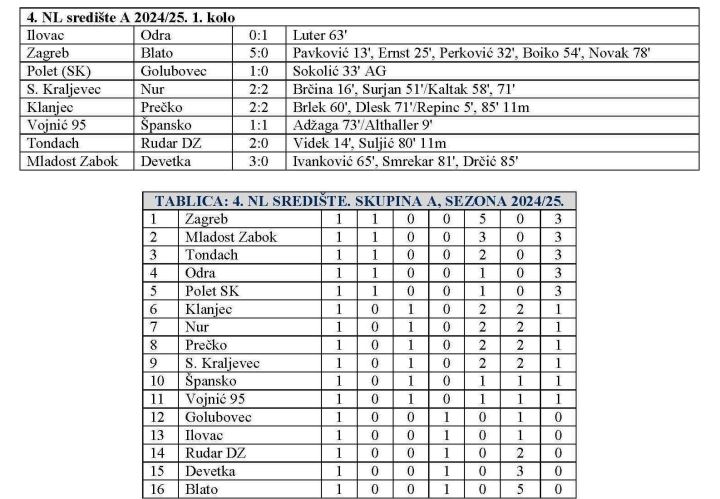 Odigrano je 1. kolo 4. NL središte Skupina A. Već sam start je donio jedan zagorski pa i susjedski derbi. Tondach je dočekao Rudar DZ. I jedni i drugi u dosta drugačijim sastavima u odnosu na prošlu sezonu. Tondach je slavio sa 2:0. Mladost iz Zaboka u novu je sezonu krenula sigurnom pobjedom protiv Devetke 3:0, no sve je riješeno u zadnjih manje od pola sata. Golubovec nije startao dobro. Autogol Patrika Sokolića presudio je pobjednika u Svetoj Klari, gdje je Polet slavio sa 1:0. Kolo je završio Klanjec, koji je u nedjelju dočekao Prečko i odigrao 2:2. U prvom kolu najuvjerljiviji je bio Zagreb, koji je sa 5:0 pobijedio Blato. Sesvetski Kraljevec i Nur igrali su 2:2, Vojnić 95 i Špansko 1:1, dok je Odra slavila kod Ilovca 1:0. I u drugom kolu na rasporedu je jedan zagorski, pa i gradski derbi jer će Rudar u Dubravi Zabočkoj u subotu u 17.30 dočekati Mladost Zabok. U isto vrijeme Golubovec će dočekati Sesvetski Kraljevec, dok će Klanjec i Tondach, također u subotnjem terminu u goste, Klanjec kod Nura, Tondach kod Španskog. Kolo će već u petak u 19 sati otvoriti Prečko i Vojnić 95, u subotu će igrati Blato i Polet (SK), u nedjelju u 10 sati Ilovac i Zagreb, a kolo će završiti u nedjelju u 17.30 sati Odra i Devetka.