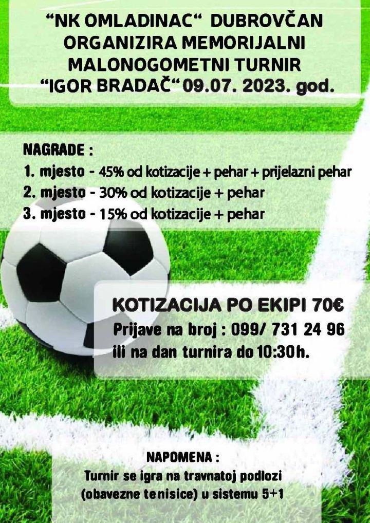 U organizaciji NK Omladinac ove će se nedjelje 9. srpnja s početkom u 10,30 sati na igralištu ovog kluba u Dubrovčanu održati memorijalni malonogometni turnir "Igor Bradač" u spomen na talentiranog nogometaša koji nas je tragično napustio prije više od 12 godina. Igor je imao tek 19 godina, ali od strane svojih prijatelja nikada nije zaboravljen.