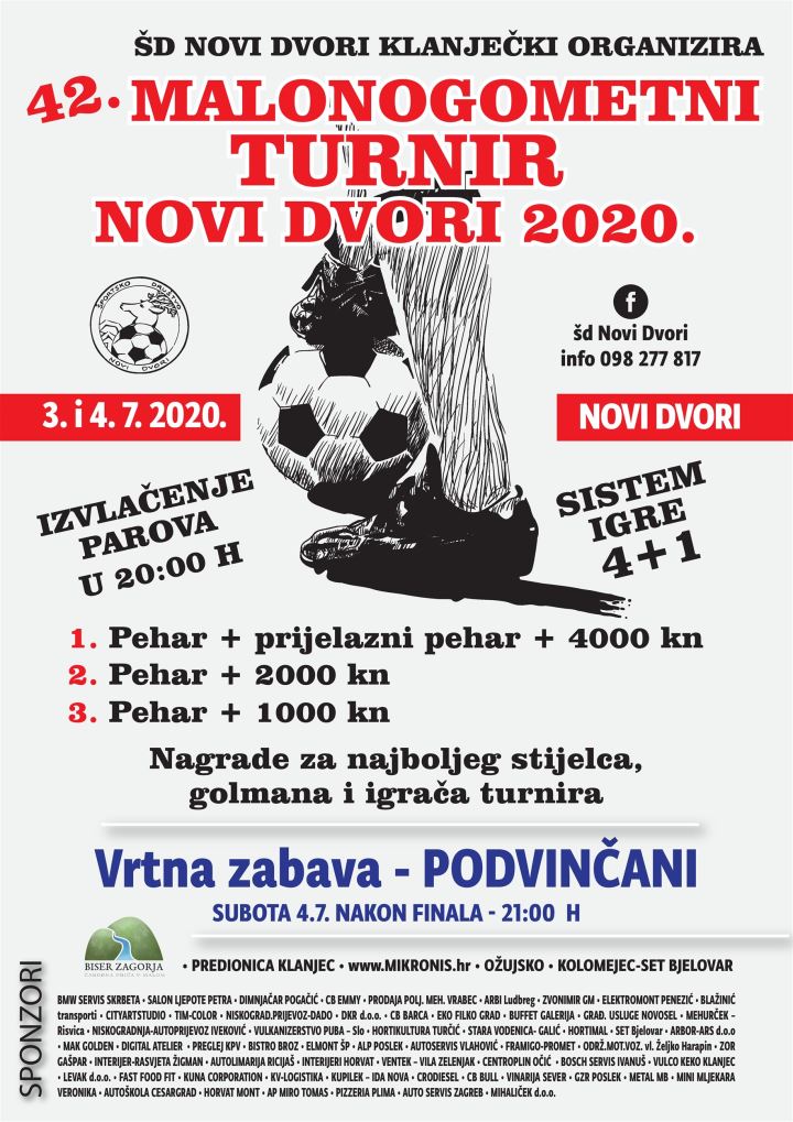 U orgranizaciji ŠD Novi Dvori Klanječki u Novim Dvorima će se u petak i subotu (3. i 4. srpnja) održati 42. izdanje malonogometnog turnira koji nosi ime ovog mjesta. Kotizacija za turnir iznosi 400 kuna, a prijave se primaju do petka 3. srpnja kada će se u 20 sati izvući parovi, a odmah nakon toga kreće turnir. Domaćin je osigurao vrijedne nagrade za najbolje momčadi i najbolje pojedince. Tako će pobjednik turnira uz 4.000 kuna dobiti i pehar i prijelazni pehar, drugoplasirana momčad bit će bogatija za 2.000 kuna i pehar, a trećeplasirana za 1.000 kuna i pehar. Posebno će biti nagrađeni najbolji igrač, strijelac i vratar turnira. Važno je napomenuti da je sustav igre na turniru 4+1, a sudit će iznimno kvalitetni zagrebački suci koji imaju iskustvo suđenja na "Kutiiji šibica". Domaćin puno polaže na segment suđenja i ne želi da nitko iz Novih Dvora ode kući oštećen, to je i razlog što se velika većina momčadi iz godine u godinu vraća u Nove Dvore.