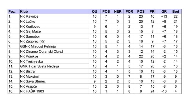 U derbiju kola Lučko je sa 3:2 pobijedilo Ravnice i zakompliciralo stanje na vrhu. I dalje vode Ravnice sa 22 boda, a Lučko je sada na 21 bod. Kurilovec je treći sa 19 bodova, ali i utakmicom manje. Gaj je na četvrtom mjestu sa 18 bodova, koliko ima i peti Samobor, a Zagorec KR je šesti sa 17 bodova.
