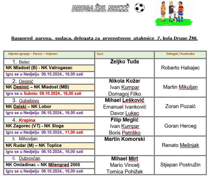 Na rasporedu je i 7. kolo 2. zagorske nogometne lige, a počinje već danas u Desiniću, gdje istoimeni domaćin dočekuje Mladost MB. No, derbi dosadašnjeg dijela prvenstva igra se sutra. Vodeći Zagorec VT dočekuje Slogu. Riječ je o dvije ekipe sa maksimalnim učinkom do sada, samo Sloga uz odigranu utakmicu manje. Ta se utakmica igra u Krapini već u 11 sati. Preostale utakmice su sutra u 16 sati. Mladost Belec dočekat će Vatrogasac, Đalski Lobor, Rudar M Toplice, dok će derbi začelja odigrati Omladinac i Milengrad 2005.