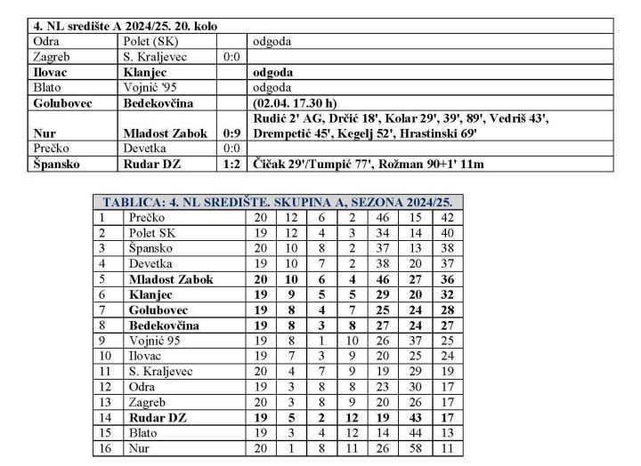 Vrijeme je jako krojilo 20. kolo 4. NL središte – skupina A. Još je u petak vodeće Prečko u derbiju sa Devetkom igralo 0:0. Isti rezultat bio je i u subotu prije podne u utakmici Zagreba i Sesvetskog Kraljevca. A u subotu poslijepodne stigle su super vijesti za zagorski i zabočki nogomet. Od Mladosti iz Zaboka svi su očekivali pobjedu kod zadnjeg Nura, ali malo tko je vjerovao u ovakvu uvjerljivost, jer Mladost je slavila sa čak 9:0. No, još je veća pobjeda Rudara DZ, koji se bori za opstanak, a u subotu je u gostima sa 2:1, nakon preokreta, slavio protiv Španskog, koje se bori za naslov. Koliko je to velika pobjeda govori podatak da je ovo tek drugi poraz Španskog u cijeloj sezoni. Zagorski derbi u ovom kolu Golubovec – Bedekovčina je pomaknut za srijedu 2. travnja u 17.30 sati, dok je u nedjelju stigla vijest da je i utakmica Klanjca kod Ilovca odgođena. Utakmice Odra – Polet (SK) i Blato – Vojnić '95' također su odgođene, bez novog termina igranja zasada. Ovom se pobjedom Mladost Zabok malo približila vodećoj četvorki, iako ima tu i još neodigranih utakmica, ali situacija je bolja. Također, Rudar DZ je i dalje na 14. mjestu, ali sada sa 17 bodova, koliko imaju i Odra i Zagreb, a nije daleko ni Sesvetski Kraljevec. I 21. kolo donosi jedan zagorski derbi. Već petak od 19 sati u Zaboku Mladost će dočekati Golubovec. Bedekovčina će u subotu dočekati Blato, koje se diglo u proljeće pa neće biti lagano. Rudar DZ će imati još jedan težak izazov, jer u nedjelju u 17 sati dočekuje Prečko, dok će Klanjec u isto vrijeme biti domaćin Zagrebu. Špansko dočekuje Odru, Devetka Nur, Vojnić '95 Ilovac, a Sesvetski Kraljevec je domaćin Poletu (SK).