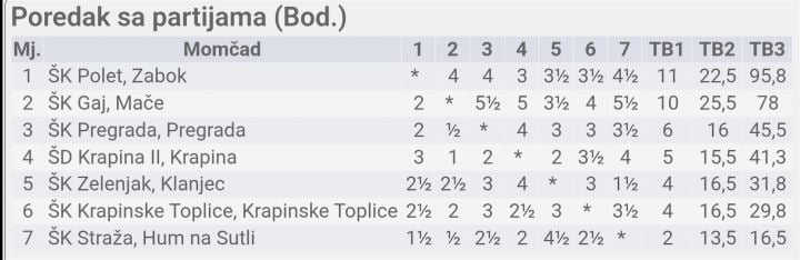 Poslije sedam odigranih kola najbolji je bio ŠK Polet iz Zaboka. Skupio je ukupno 11 bodova iz pet pobjeda i jednog remija protiv ŠD Krapine II. Susret protiv najvećeg konkurenta za prvo mjesto ŠK Gaj Mače odigran je u petom kolu u Zaboku. Nakon velike borbe ŠK Polet Zabok je pobijedio 4:2. Poslije te pobjede prvenstvo je rutinski privedeno kraju pobjedama 4 1/2 : 1 1/2 protiv ŠK Straže iz Huma na Sutli i protiv ŠK Pregrade 4:2.