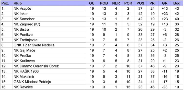 Zagorski klubovi osvojili su četiri od mogućih šest bodova u 19. kolu III. NL-centar. Odlični Zagorec KR slavio je u gostima kod Samobora i skinuo ga s trona, dok se Gaj s Peščenice vratio s bodom. Domaće posrtanje Samobora iskoristilo je Vrapče koje se gostujućom pobjedom kod Mladosti P vratilo na vrh, ali i Inker koji je pobjedom protiv Ravnica zasjeo na treće mjesto.