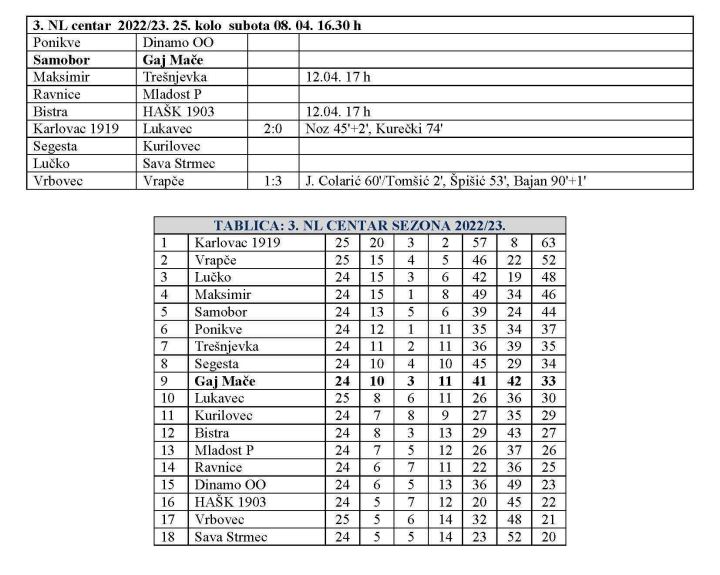 Gaj Mače će svoju obvezu u 25. kolu riješiti također danas i to u 16.30 kod Samobora, koji se nalazi na visokom petom mjestu. U zadnjih par utakmica Gaj je odigrao nekompletan, a ako danas istrči u kompletnom sastavu, sigurno može parirati.