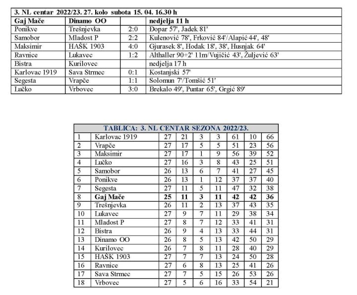 Još i prije Zagorca svoju će utakmicu danas odraditi i Gaj Mače, koji u 28. kolu 3. NL centar u 11 sati dočekuje Dinamo iz Odranskog Obreža. I Gaj je u dijelu sezonu u kojem mu ide vrlo dobro i kao favorit ulazi u utakmicu protiv ekipe koja se bori za opstanak. Većina utakmica, sve osim još jedne ovog kola je već odigrana, pa donosimo pregled kola i ljestvicu. Ističe se domaći poraz vodećeg Karlovca od Save Strmec koja se bori za opstanak.