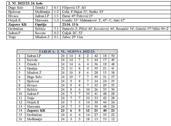 Novi nogometni vikend u SuperSport 2. NL krenuo je već prekjučer, a završava danas i to utakmicom koja naviše zanima zagorske navijače, Naime, u posljednjoj utakmici 24. kola Zagorec Krapina će od 13 sati dočekati Opatiju . Iako je Opatija visoko na ljestvici, Zagorec želi nastaviti pozitivnu seriju bez poraza i sigurno će imati svoju šansu. Sve ostale utakmice ovog kola su odigrane, pa donosimo pregled istih i trenutno stanje na ljestvici.