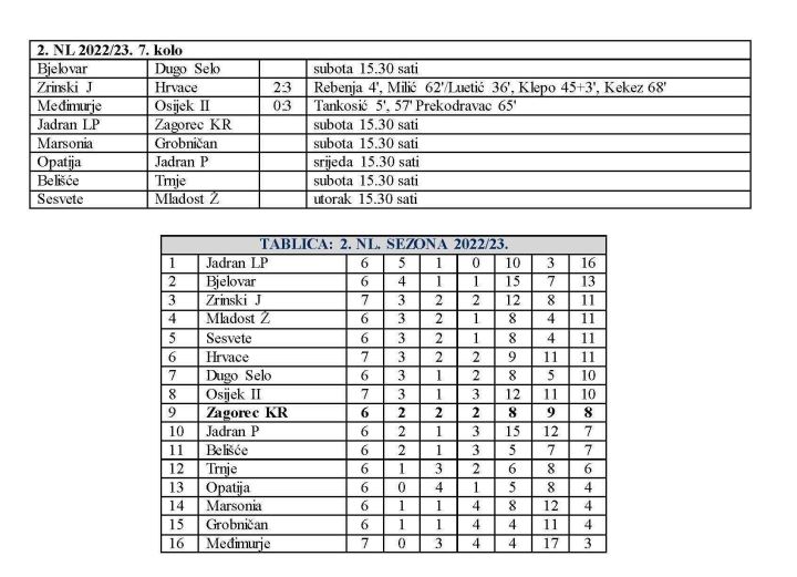 Već jučer je počelo 7. kolo SuperSport 2. NL, a odigrane su dvije utakmice. Inače ovo kolo proteže se sve do srijede. Zagorec Krapina svoju će utakmicu odigrati danas s početkom u 15.30 i to u Pločama, kod Jadrana LP. Neće to biti lagano gostovanje za Zagorec, jer se radi o vodećoj ekipi na ljestvici.