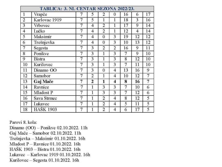 U 3. NL centar Gaj Mače će sutra dočekati Samobor. Bit će to vrlo važna utakmica za Gaj, koji se nalazi na 13. mjestu sa sedam bodova, samo dva više od zadnjeg mjesta, a baš Samobor ima isti broj bodova i nalazi se poziciju više, pa je ovo višestruko značajna utakmica za Gaj. Inače, većina utakmica ovog kola u 3. NL centar igra se danas, točnije šest, a uz onu u Maču, sutra se igraju još dvije utakmice.