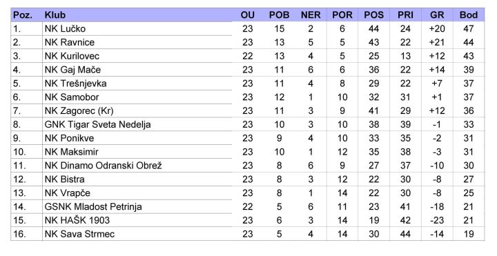 Gaj Mače pak gostuje kod Dinama u Odranskom Obrežu. Gaj u utakmicu ulazi sa četvrtog mjesta, dok Dinamo drži 11., pa će biti zanimljivo vidjeti može li Gaj do dobrog rezultata u gostima. Inače pravi derbi igra se u Zagrebu, gdje vodeće Lučko dočekuje treći Kurilovec. Sve utakmice igraju se u subotu u 17.30 sati.