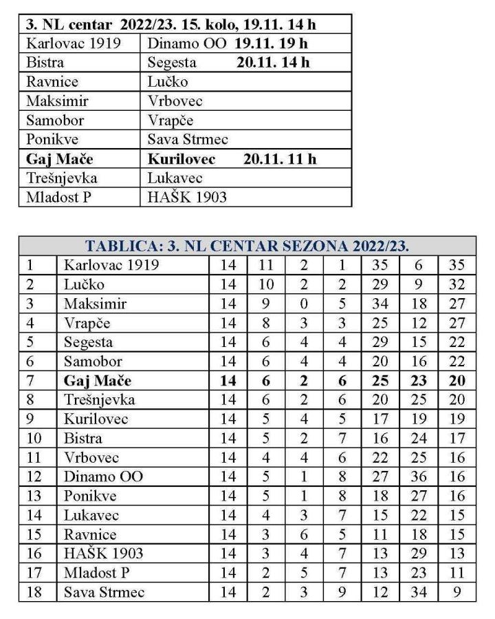 Gaj Mače će pak u nedjelju u 15. kolu 3. NL centar dočekuje Kurilovec. Gaj je imao seriju od pet utakmice bez poraza, ali je kolo prije poražen kod Lukavca, pa će u nedjelju tražiti povratak pobjedama.