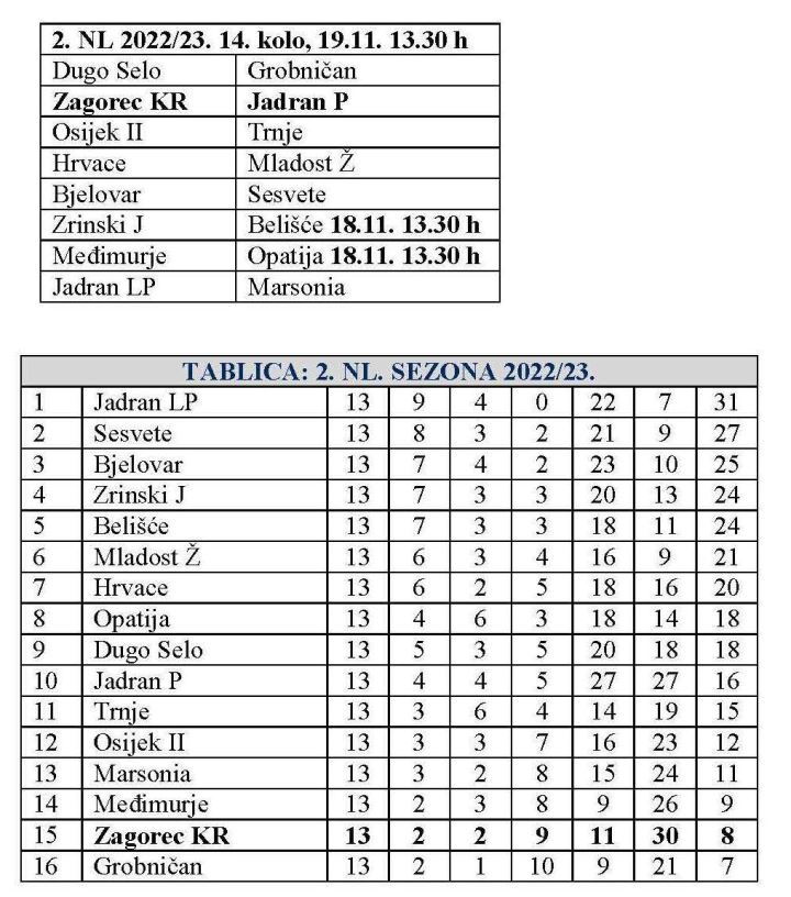 Zagorec iz Krapine očajnički želi prekinuti niz poraza, a nova prilika je sutra u Krapini kada u goste dolazi Jadran iz Poreča i to u 14. kolu. Zagorec je na predzadnjem mjestu. Ovo je predzadnji jesenski nastup, a u zadnjem čeka ga gostovanje kod Grobničana, jedine ekipe koja je na ljestvici iza Zagorca. Dakle, ne stigne li konačno neki pozitivan rezultat, Zagorec bi proljeće mogao dočekati na samom dnu. Dođite sutra u 13.30 i podržite Zagorec.