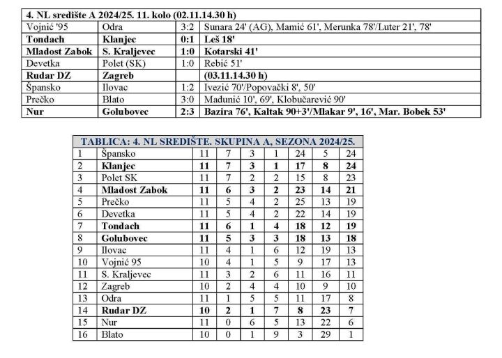 Odigrano je još šest utakmica 11. kola 4. NL središte skupina A. Veliki zagorski derbi odigrali su Tondach i Klanjec. Bilo je zanimljivo, svoje šanse imao je i Tondach, ali Klanjec je u dijelu sezone kad mu sve ide, samopouzdanje je na vrhu, momčad je posložena od prvog do zadnjeg detalja i rezultat je tu. Zabio je Marko Leš za pobjedu kojom se Klanjec izjednačio na vrhu sa Španskom.
