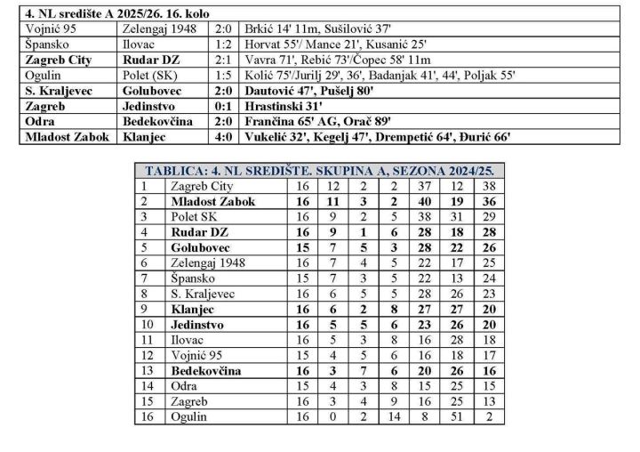 Krenulo je i natjecanje u 4. NL središte skupina A. Odigrano je 16. kolo, koje je još u petak otvorio zagorski derbi u Zaboku. Mladost je sa 4:0 svladala Klanjec i najavila velike stvari, no naravno trebat će tako i nastaviti. To ipak nije bilo dovoljno za preuzimanje vodstva, jer je Zagreb City dan kasnije pobijedio Rudar DZ sa 2:1, iako su ''rudari'' poveli. Tako je Zagreb City ostao na čelu sa 38 bodova, a Mladost Zabok ima 36. Na treće mjesto je skočio je Polet (SK), nakon 5:1 pobjede kod Ogulina. Ima 29 bodova, a Rudar DZ je sada četvrti sa 28 bodova. Golubovec je poražen kod Sesvetskog Kraljevca, i sada sa utakmicom manje na petom mjestu ima 26 bodova. Jedinstvo je stiglo do važne pobjede 1:0 kod Zagreba i sada je na desetom mjestu sa 20 bodova, koliko ima i deveti Klanjec. Kolo je zatvorila utakmica Odra – Bedekovčina u nedjelju. Odra je slavila sa 2:0, pa je Bedekovčina sada na 13. mjestu sa 16 bodova. U 17. kolu nema zagorskih derbija. Kolo će opet otvoriti u petak utakmica u Zaboku, jer Mladost u drugoj domaćoj utakmici zaredom dočekuje Vojnić '95. Svi zagorski predstavnici u 16. kolu igraju domaće utakmice, pa će tako u subotu u 15.30 sati zagorski ljubitelji nogometa moći birati između tri, a u nedjelju u isto vrijeme između dvije utakmice. U subotu Golubovec dočekuje Ogulin, Jedinstvo Sesvetski Kraljevec, a Bedekovčina Zagreb. U nedjelju Rudar DZ dočekuje Špansko, dok će Klanjec biti domaćin Odri. U preostalim utakmicama, u subotu se sastaju: Polet (SK) – Zagreb City i Ilovac – Zelengaj 1948.