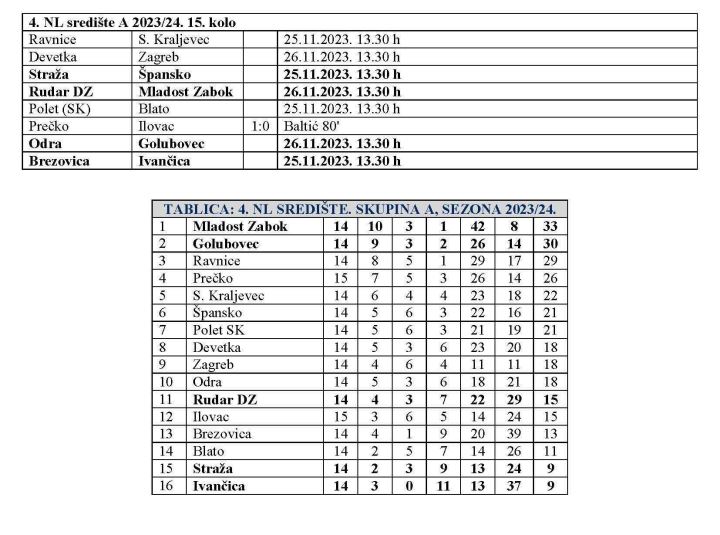Ovoga vikenda završit će jesenski dio sezone u 4. NL središte skupina A. Svoj posao za jesen su odradili Prečko i Ilovac. Naime, već sinoć Prečko je slavilo sa 1:0 i samo se učvrstilo na četvrtom mjestu. Posljednje jesensko kolo donosi jedan zagorski, ujedno i zabočki derbi, jer će sutra u 13.30 sati Rudar DZ dočekati Mladost iz Zaboka. Golubovec će jesensku sezonu završiti utakmicom kod Odre, također sutra u 13.30 sati. Važne bodove u borbi za opstanak već danas će pokušati uhvatiti Straža i Ivančica. Straža dočekuje Špansko, a Ivančica gostuje kod Brezovice. Utakmice počinju 13.30 sati.