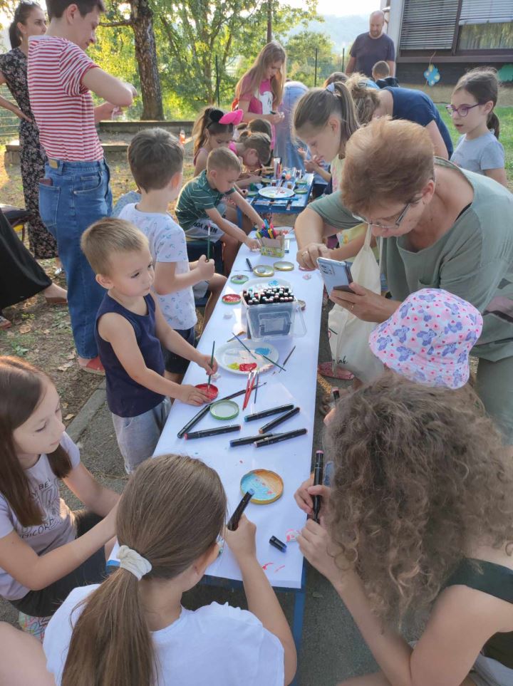 Tako su nastali originalni ukrasi-magneti. Hladnom lubenicom svi su se zasladili na kraju i nastavili družiti uz mame, tate, bake, u sjeni breza i borova. Voditeljica radionice bila je Ivana Kmetić.